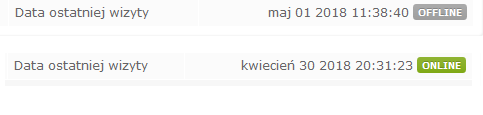 Witam, Zastanawiam si? jak naprawi? obok daty ostatniej wizyty napis ONLINE/OFFLINE. Problem jest taki, ?e nie dzia?a poprawnie. U?ytkownicy, którzy logowali si? kilka lat temu ostatni raz - pisze ONLINE a u osób aktualnie zalogowanych - pisze OFFLINE. Przyk?ad: https://www.astro...lookup=461